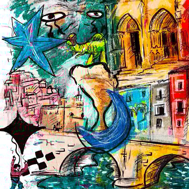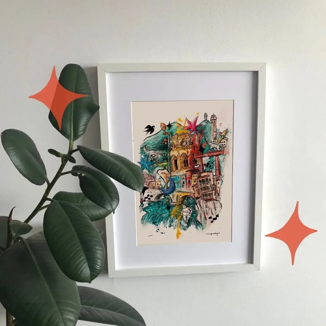 🎨Edición numerada de Ilustración de Cuenca con técnica mixta inspirada en la ciudad, sus rincones y elementos más representativos recreados en papel hecho a mano artesanal de 250/300 gramos.
